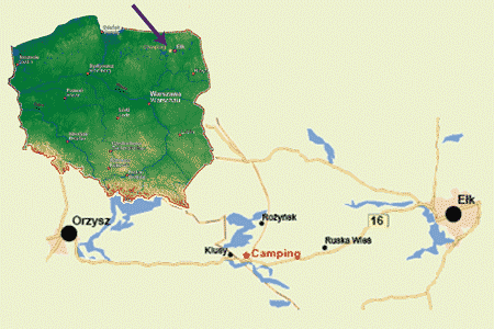 Unser Campingplatz liegt an der S16, in der Mitte zwischen ORZYSZ (16km) und ELK (15km), an der Abzweigung in Richtung ROZYNSK.